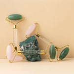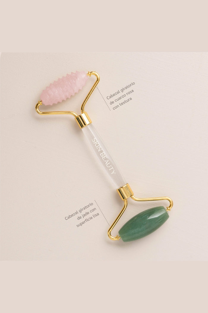 Rodillo con dos cabezales giratorios de piedra natural de jade y cuarzo rosa. Su uso se basa en una técnica milenaria de belleza que se usa en China desde hace siglos atrás. Sus dos cabezales tienen diferentes texturas lo que potencia la estimulación de los músculos faciales: el cabezal de piedra jade es liso, produciendo un masaje más suave, relajante y confortable; y el cabezal de piedra cuarzo rosa tiene puntas que permiten un masaje facial más intenso, ideal para estimular y mejorar la circulación sanguínea.
