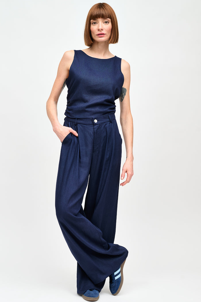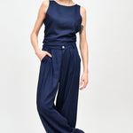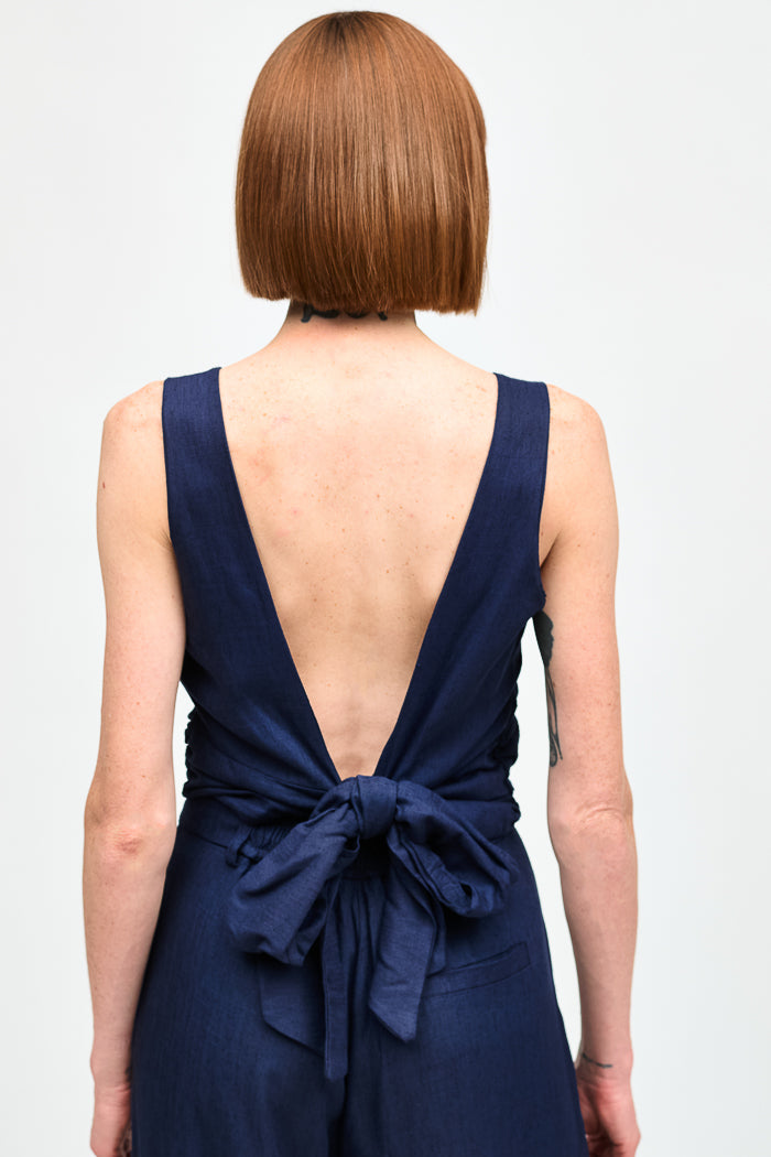 Blusa sin mangas en viscosa y lino italiano. Espalda descubierta, con amarras para ajustar a la cintura.